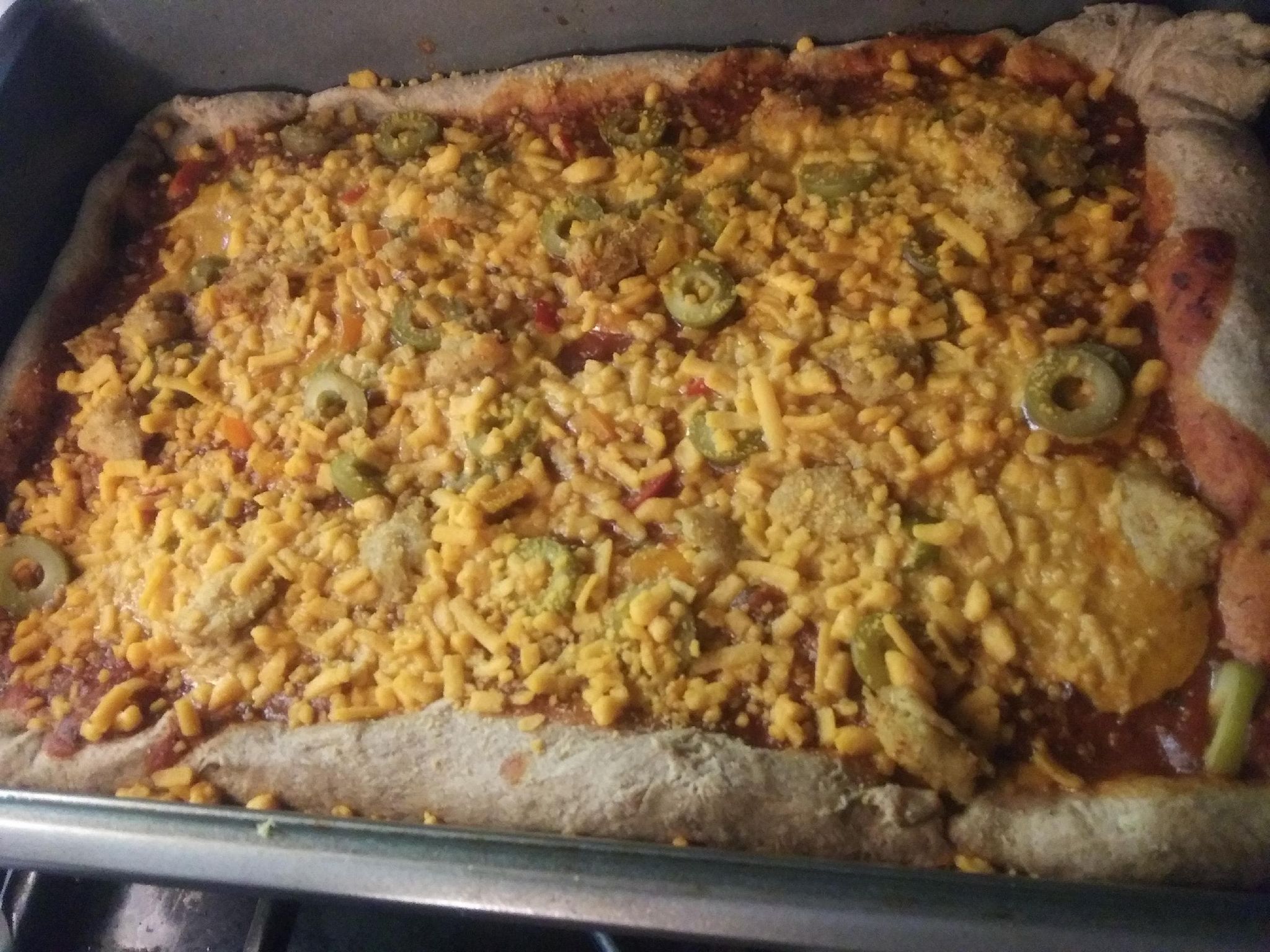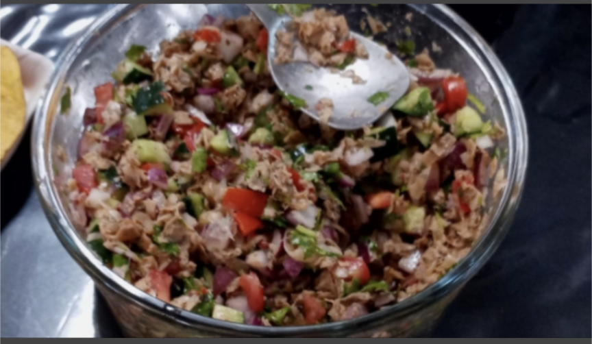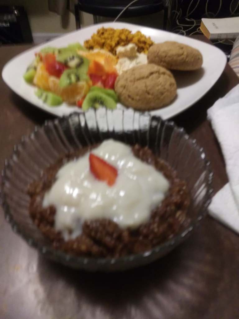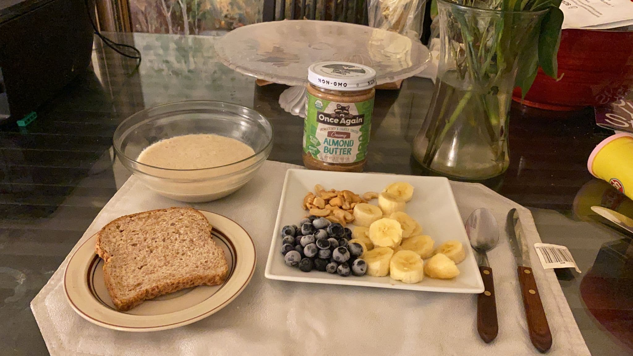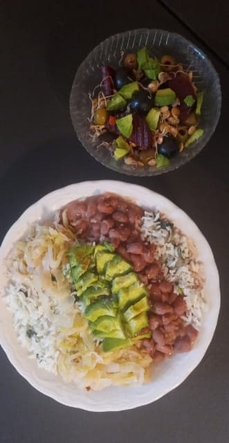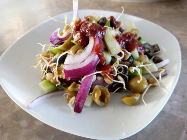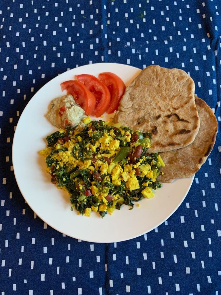 Tofu Scramble with Sautéed Kale, Peppers, Onions, and Red Beans. Spelt Flat Bread with Hummus and Tomatoes.